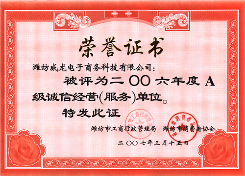 業(yè)經(jīng)公司全體干部員工的共同努力,以及廣大客戶和各級(jí)領(lǐng)導(dǎo)的大力支持,我司在2007年3月15日來(lái)臨之際榮獲濰坊市工商局和濰坊市消費(fèi)者協(xié)會(huì)共同頒發(fā)的誠(chéng)信經(jīng)營(yíng)單位獎(jiǎng)牌。這是對(duì)我司過(guò)去五年來(lái)經(jīng)營(yíng)歷程所給予的高度評(píng)價(jià)。我司也會(huì)在以后工作當(dāng)中,進(jìn)一步增強(qiáng)保護(hù)消費(fèi)者合法權(quán)益的責(zé)任感和使命感,按照消費(fèi)者協(xié)會(huì)提出的“消費(fèi)和諧”的主題,抓住有利時(shí)機(jī),加強(qiáng)隊(duì)伍建設(shè),繼續(xù)為創(chuàng)造和諧的社會(huì)市場(chǎng)、促進(jìn)電子商務(wù)的發(fā)展,做出我們最大的努力!