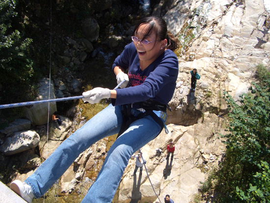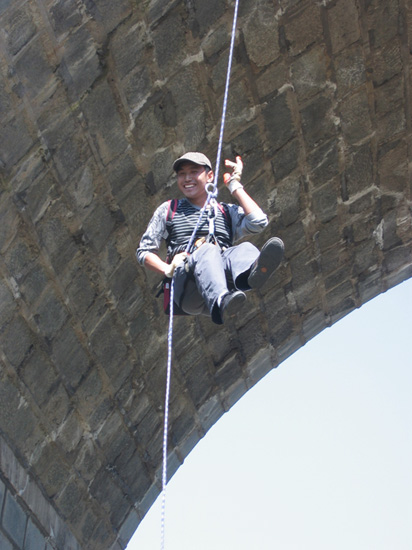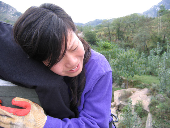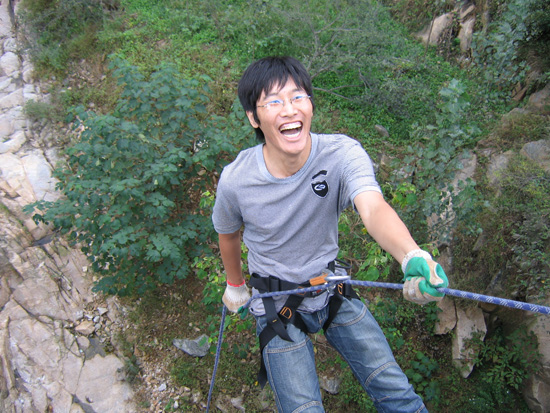 第一個項目是速降,就是從幾十米高的地點跳下,當(dāng)然是要系安全帶的。我們采用的是坐式、主腰扣、八字環(huán)、手套……然后……跳下來……自己掌握下降的速度、落點,以到達(dá)地面。速降并不需要嚴(yán)格的專業(yè)技巧,但只要開始下降,就無法退縮,必須克服恐懼與障礙、堅持到底。從自我激勵、自我控制到超越自我,最終走向成功。這是對自己極限的挑戰(zhàn),一開始有些同事不敢下降,但是看到好多人都已經(jīng)安全地下去了,也沉不住氣想要去嘗試一下了,最終在大家的鼓勵與隊長的指導(dǎo)下跳了下來,當(dāng)腳著地的那一刻,心中的恐懼、疑慮都已全部消散,取而代之的是戰(zhàn)勝自我的喜悅,那也是一種感動,為自己的成功而感動!