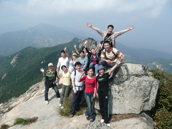 清晨的山峰全都彌漫在了朦朧的薄霧中,一番收拾之后,開始了我們的云峰之行。山路是崎嶇的,其實也算不上是條路,只是走的人多了而踩成的一條羊腸小道,有的地方需要手腳并用才能爬上去。一路上,大家相互你拉我一下,我推你一把,有難走的地方都是互相提醒注意腳下的路滑。有人想要放棄的時候,大家一齊鼓勵他,為他加油。我們當(dāng)中的每個人都被這種團(tuán)隊精神所感動。尤其是在最后攀巖的過程中,我們互相鼓勵,相互攙扶,硬是攀上了高十幾米的陡峭懸崖,到達(dá)峰頂。我們歡呼雀躍,盡情歡呼,享受“一覽眾山小”的喜悅。
